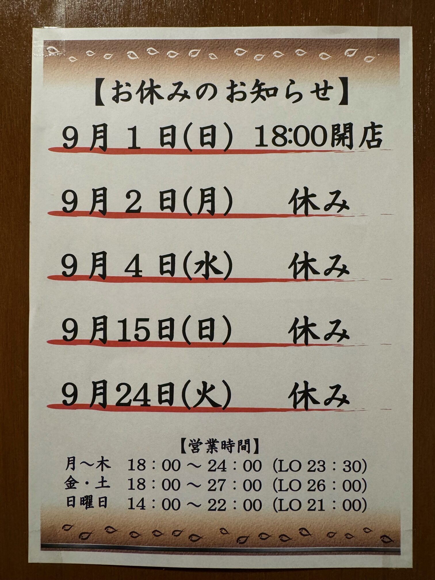 今回は【9月のお休みのお知らせ】です。